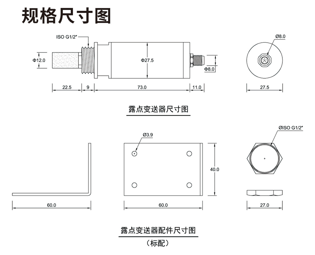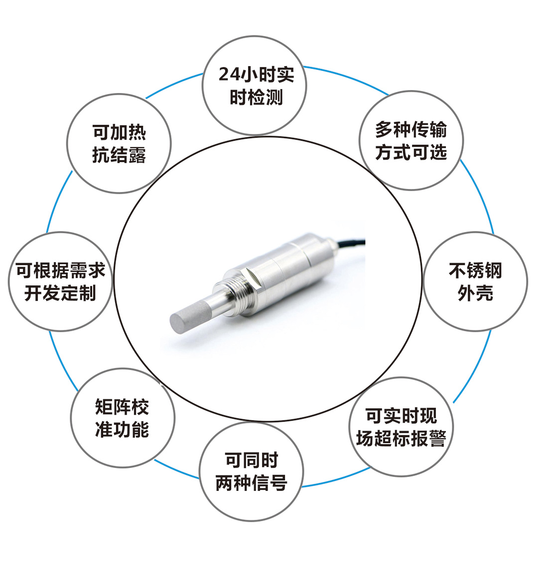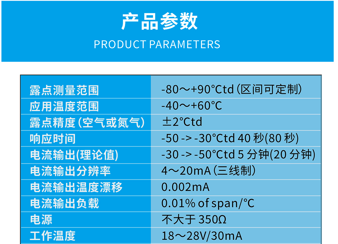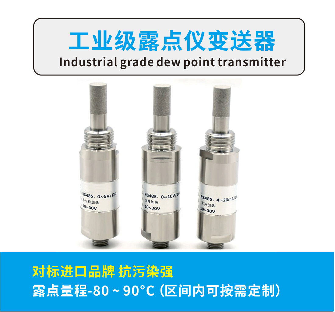 露點變送器采用的是熱固聚合物高分子敏感電容,響應迅速,穩定可靠,測量范圍為-60℃~20℃,精度全量程+ -2℃,本產品具有自動校準零點功能,長期使用性能穩定