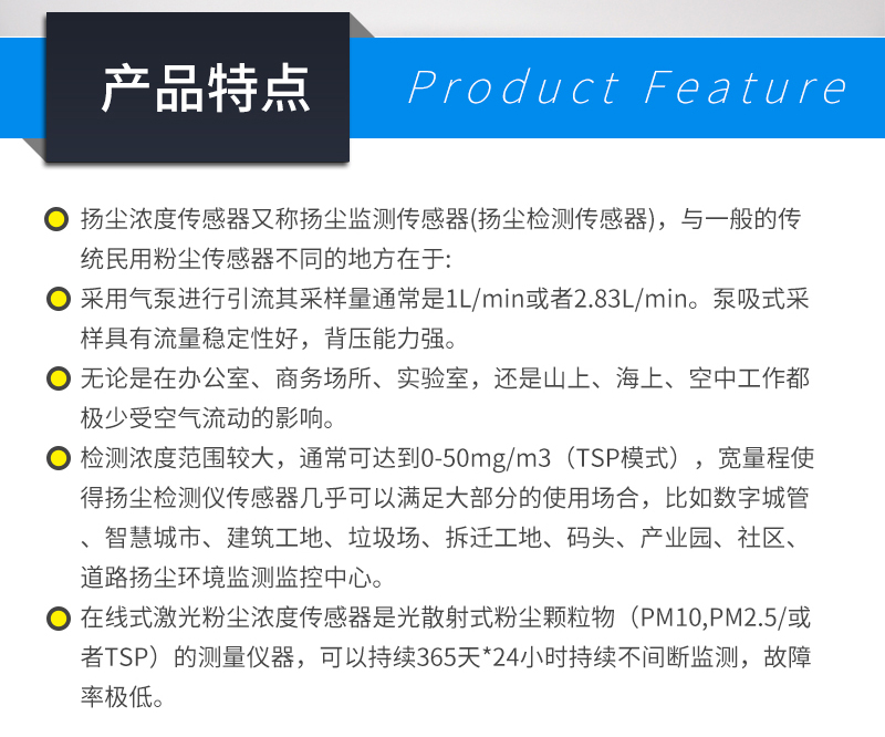 揚塵濃度傳感器又稱揚塵監(jiān)測傳感器(揚塵檢測傳感器),與一般的傳統(tǒng)民用粉塵傳感器不同的地方在于: