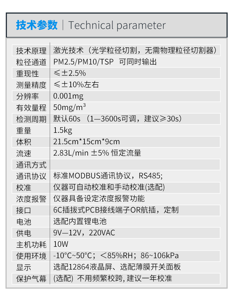 PM2.5/PM10/TSP同時檢測同時輸出、免維護(hù)、產(chǎn)品可靠性高。測量范圍:0.001-50mg/m3。示值誤差:±10%,產(chǎn)品通過CPA(計量器具型式批準(zhǔn)認(rèn)證),標(biāo)準(zhǔn)MODBUS通訊協(xié)議,RS485通訊接口,適合各類環(huán)境監(jiān)測系統(tǒng)集成,