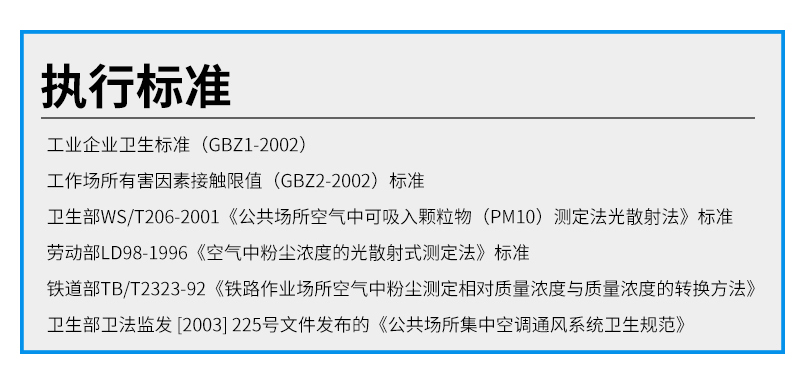| 執(zhí)行標(biāo)準(zhǔn) | 工業(yè)企業(yè)衛(wèi)生標(biāo)準(zhǔn)(GBZ1-2002) 工作場所有害因素接觸限值(GBZ2-2002)標(biāo)準(zhǔn) 衛(wèi)生部WS/T206-2001《公共場所空氣中可吸入顆粒物(PM10)測定法-光散射法》標(biāo)準(zhǔn) 勞動部LD98-1996《空氣中粉塵濃度的光散射式測定法》標(biāo)準(zhǔn) 鐵道部TB/T2323-92《鐵路作業(yè)場所空氣中粉塵測定相對質(zhì)量濃度與質(zhì)量濃度的轉(zhuǎn)換方法》 衛(wèi)生部衛(wèi)法監(jiān)發(fā) [2003] 225號文件發(fā)布的《公共場所集中空調(diào)通風(fēng)系統(tǒng)衛(wèi)生規(guī)范》 |