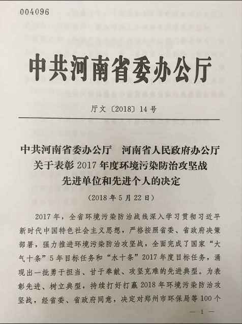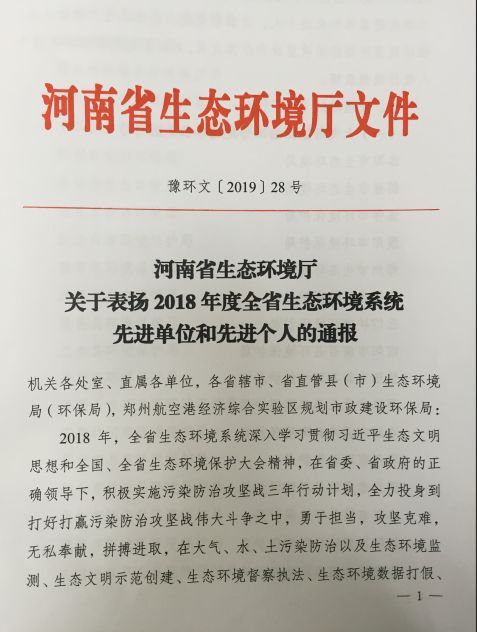 2018年被河南省委、省政府聯(lián)合表彰為全省環(huán)境污染防治攻堅(jiān)戰(zhàn)先進(jìn)單位,5人被表彰為先進(jìn)個(gè)人。 |