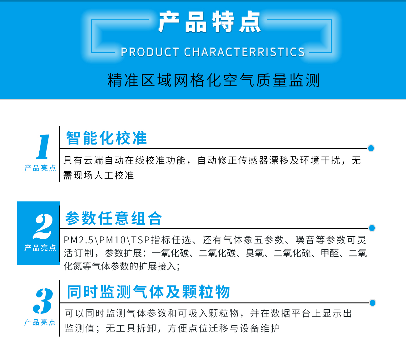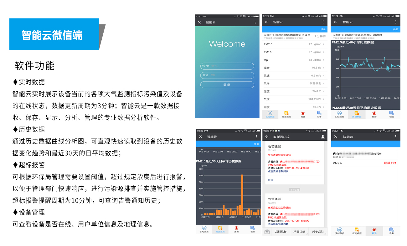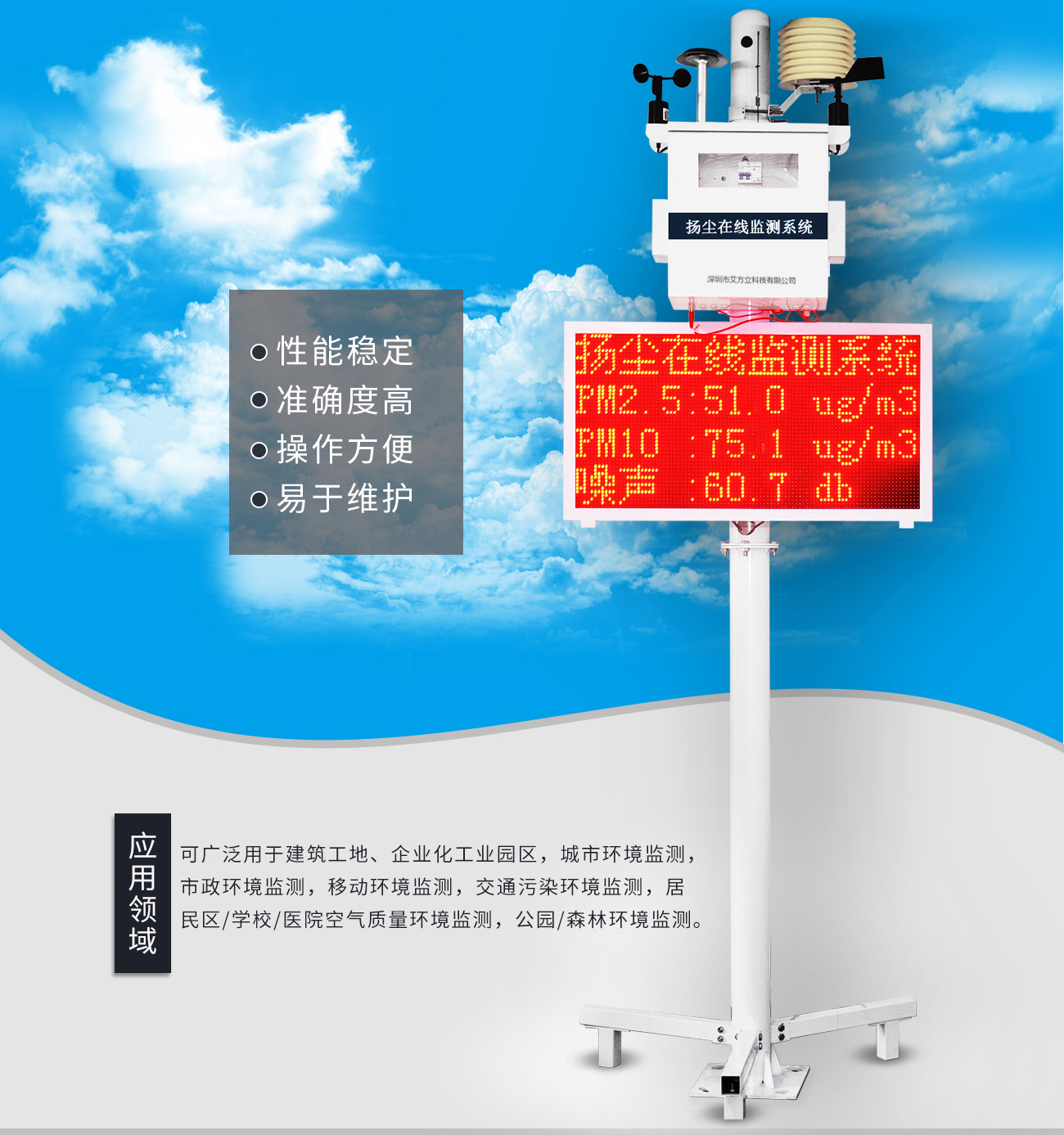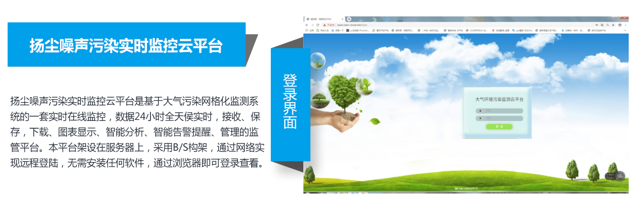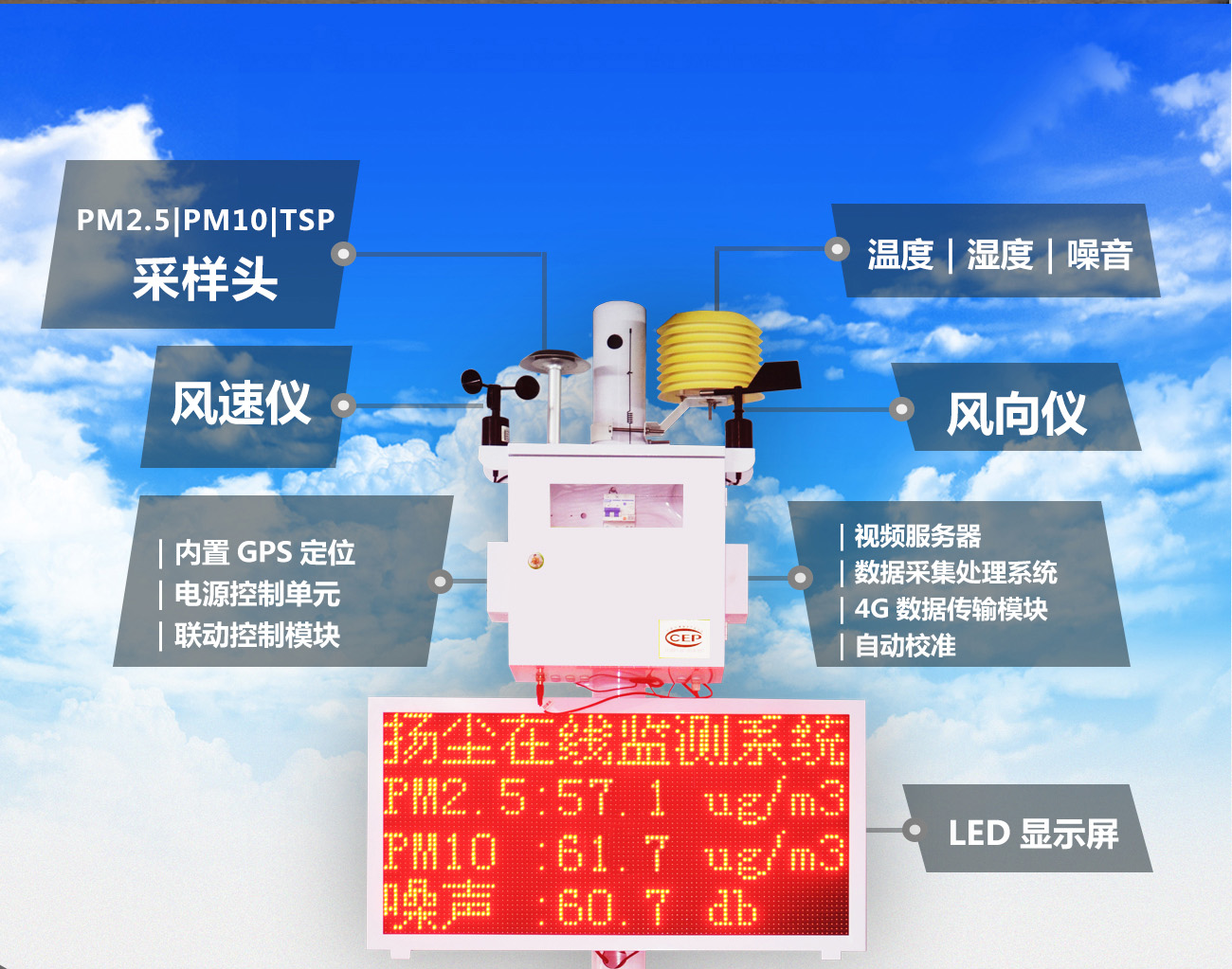 系統由揚塵實時在線監測系統、數據顯示分析系統、預警控制系統、噴淋系統(霧炮)、無線傳輸系統、后臺數據處理系統及信息監控管理平臺組成。在線監測系統集成了 TSP,PM2.5,PM10 揚塵,噪聲,溫度濕度風速風向大氣壓,降雨量,視頻等多種監測指標;云平臺是一個互聯網架構的網絡化平臺,具有對監測站的監控功能以及對數據的報警處理、記錄、查詢、統計、報表輸出等多種功能。該系統還可與各種污染治理裝置(霧炮)塔吊噴水系統、圍墻噴淋等聯動,以達到自動控制的目的。功能特點