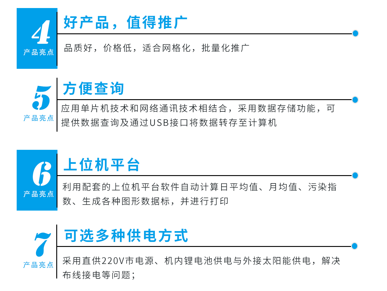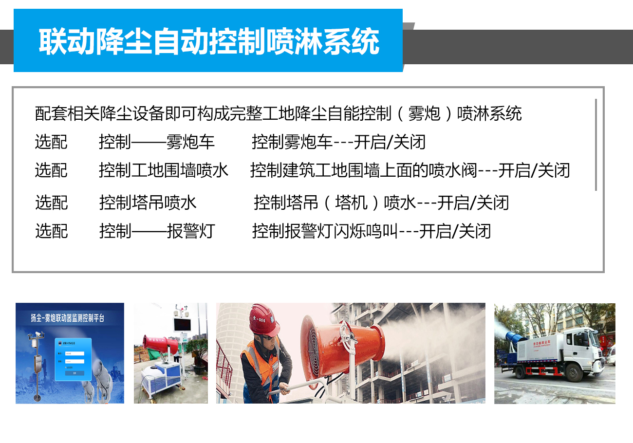1.實時的在線揚塵監測,具有自動控制以及聲光報警功能,當揚塵值達到設定上限時自動啟動一處或者多處(霧炮)噴淋系統的開啟,對現場環境進行霧化噴淋降塵措施,當揚塵值達到設定下限值時自動關閉噴淋系統。