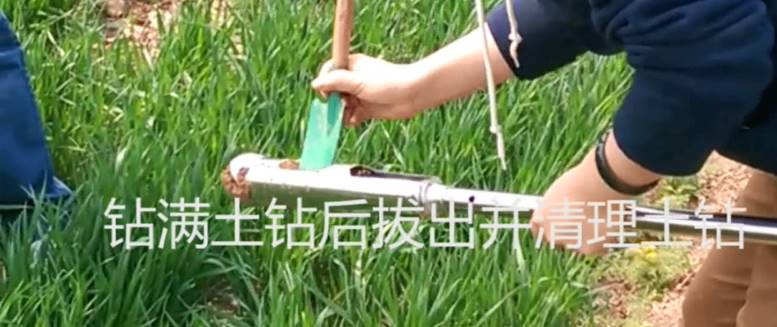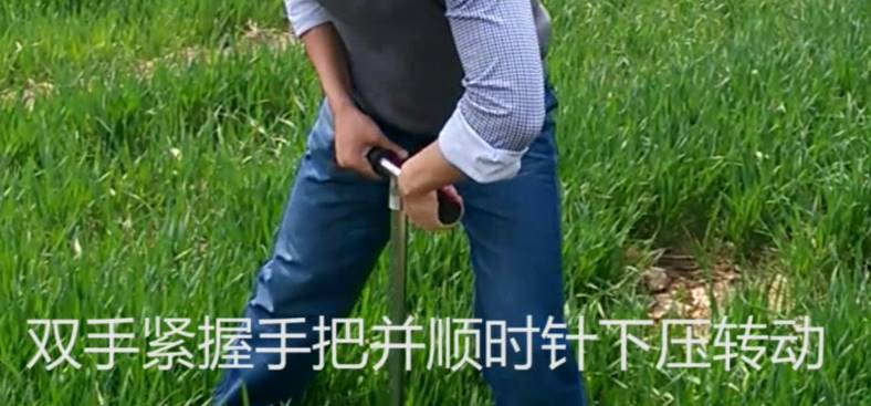 1. 用取土鉆打孔,雙手緊握手把并順時(shí)針下壓轉(zhuǎn)動(dòng);