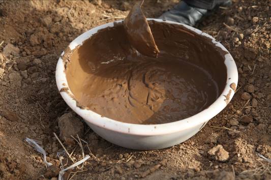 4.準(zhǔn)備好泥漿,泥漿不能太稀也不能太稠,將泥漿倒入孔洞中,大約到孔洞的一半。