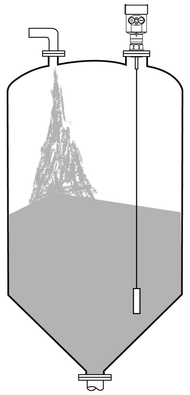 | l 安裝位置: Ø 盡量遠離出料口和進料口。 Ø 金屬罐在整個量程范圍內不碰罐壁及罐底。 Ø 建議安裝在料倉直徑的1/4或1/6處,與罐 壁的最小距離為測量范圍的1/10。 Ø 纜式或桿式探頭離罐壁最小距離≥300mm。 Ø 探頭底部距罐底≥30mm。 Ø 探頭距罐內障礙物最小距離≥200mm。 Ø 如果容器底部是錐型的,可以安裝罐頂中央。 (由于傾斜的固體表面會造成回波衰減,甚至丟失信號的問題) |