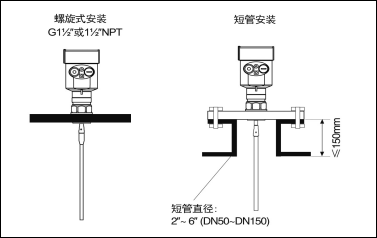 導波雷達物位計可采用螺紋連接,螺紋的長度不要超過15mm,還可以采用在短管上安裝。安裝短管直徑在2″至6″則安裝短管高度應≤100mm(螺紋及短管的長度越短,測量越穩定),若安裝短管較長,理想狀態應將短管割短,或底部固定纜式探頭及選用絕緣對中支架以避免纜式探頭與短管末端接觸。