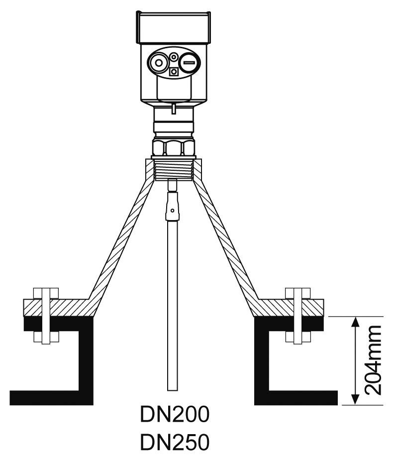 當導波雷達需要安裝于直徑大于200mm短管時,短管內壁產生回波,在介質介電常數低的情況下會引起測量誤差。因此,對于一個直徑為200mm或250mm的短管,需要選一個帶“喇叭接口”的特殊法蘭。