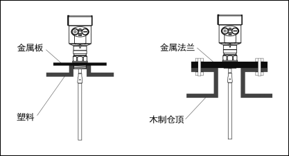 無論是纜式或桿式,若想導波雷達工作正常,過程連接表面應為金屬。當導波雷達裝在塑料罐上時,若罐頂也是塑料或其它非導電材質時,儀表需要配金屬法蘭,若采用螺紋連接,需配一塊金屬板。