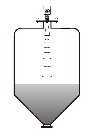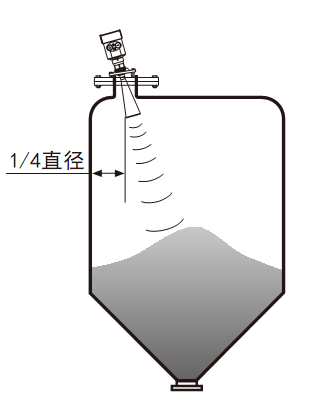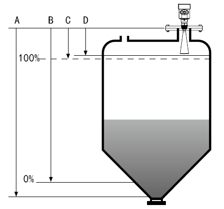 注:使用雷達物位計時,務(wù)必保證最高料位不能進入測量盲區(qū)(圖中D所示區(qū)域)。