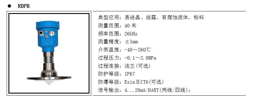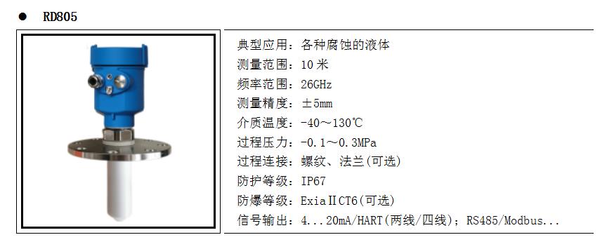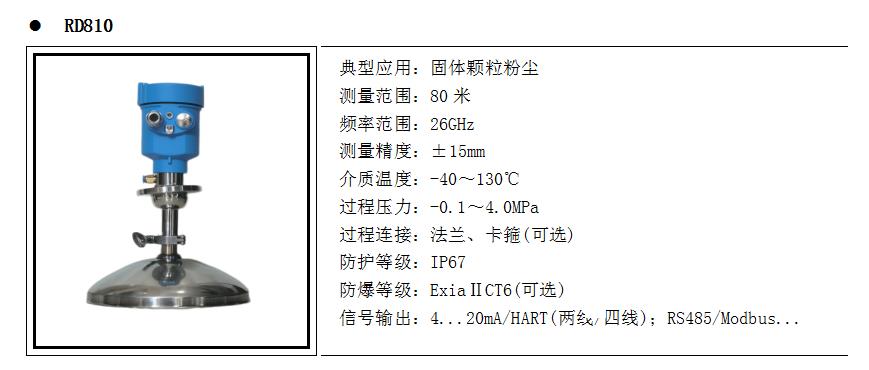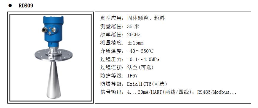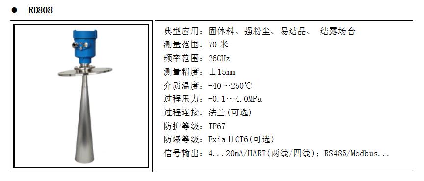 RD80X系列傳感器是26G高頻雷達式物位測量儀表,測量最大距離可達80米。天線被進一步優(yōu)化處理,新型快速的微處理器可以進行更高速率的信號分析處理,使儀表可以用于反應(yīng)釜、固體料倉等一些復雜的測量條件。