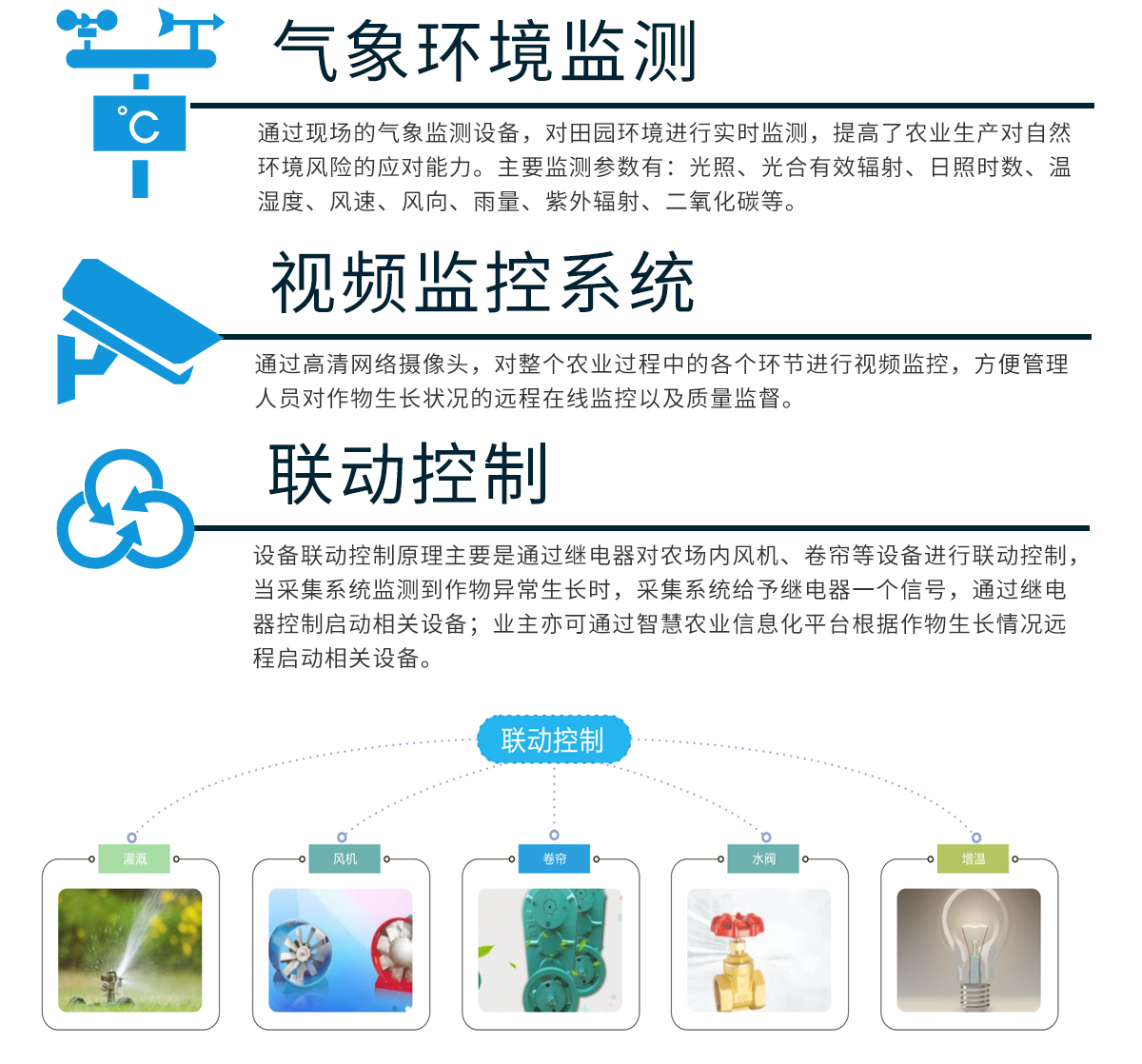 智慧農業監控系統立足現代農業發展目標,融入了先進的“物聯網,移動互聯網,云計算”技術,借助個人電腦,智能手機等終端設備,實現對農業生產現場氣象、土壤,水源環境的實時監測,并對大棚,溫室,灌溉等農業設施實現遠程自動化控制。結合視頻采集,自動預警等強大功能,系統可幫助廣大農業工作者即時掌握農作物生長狀況及環境變化趨勢,保證作物生長。