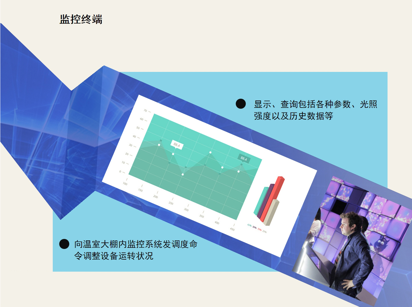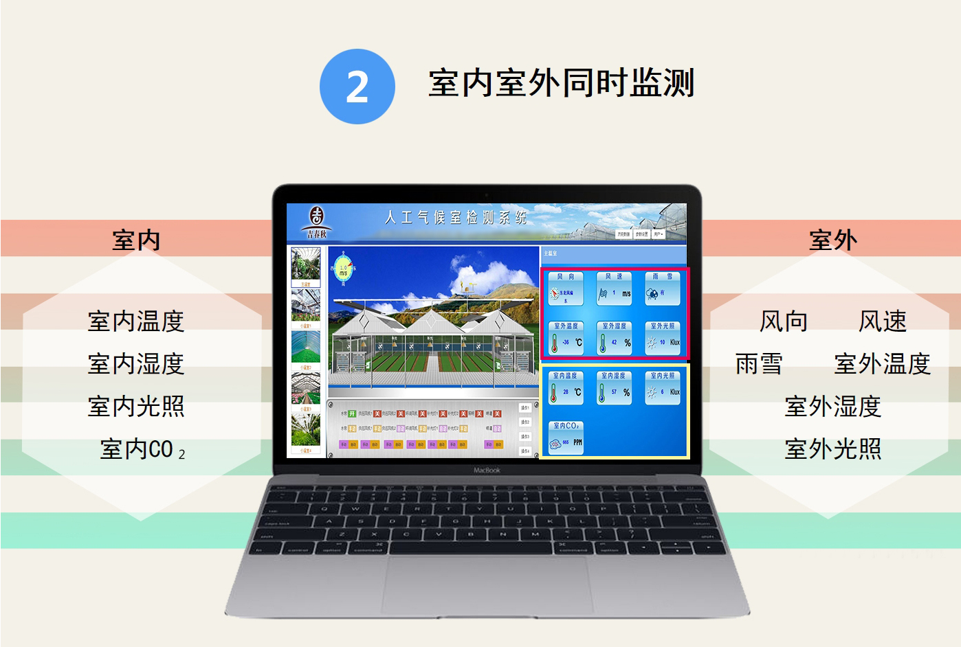 主要監(jiān)控室內(nèi)空氣溫濕度、二氧化碳、光照強(qiáng)度、土壤溫濕度,室外風(fēng)向、風(fēng)速、空氣溫濕、光照強(qiáng)度、雨雪等參數(shù),各個設(shè)備的運(yùn)作狀態(tài),當(dāng)室內(nèi)出現(xiàn)異常時會進(jìn)行報警上報負(fù)責(zé)人。 |