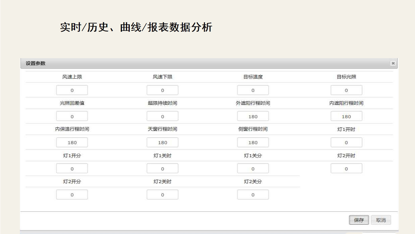 對所有要實現(xiàn)自動控制的參數(shù)(風(fēng)速、光照、土溫、土濕、空氣溫濕、內(nèi)遮陽、內(nèi)保溫、燈光、補(bǔ)光、目標(biāo)溫度、目標(biāo)光照、噴灌)進(jìn)行設(shè)定,滿足自動化要求。 |
