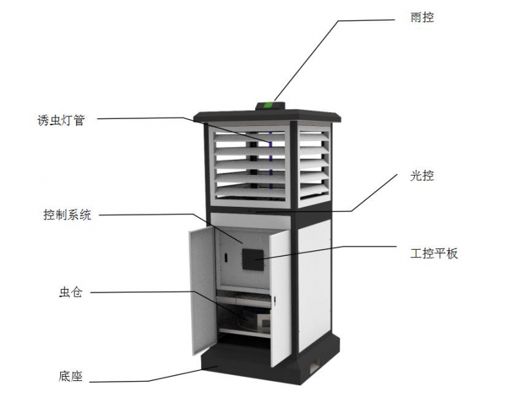 系統采用不銹鋼整體結構,利用光、電、數控技術,物聯網系統,氣象系統等多種系統,實現蟲體遠紅外自動處理、接蟲盒自動轉換、整燈自動運行等功能;在無人監管的情況下,能自動完成誘蟲、殺蟲、收集、分裝、排水等系統作業。該系統對昆蟲的發生、發展進行監測、分析和預測,為農業現代化提供服務,滿足蟲情測報、采集標本的需要。